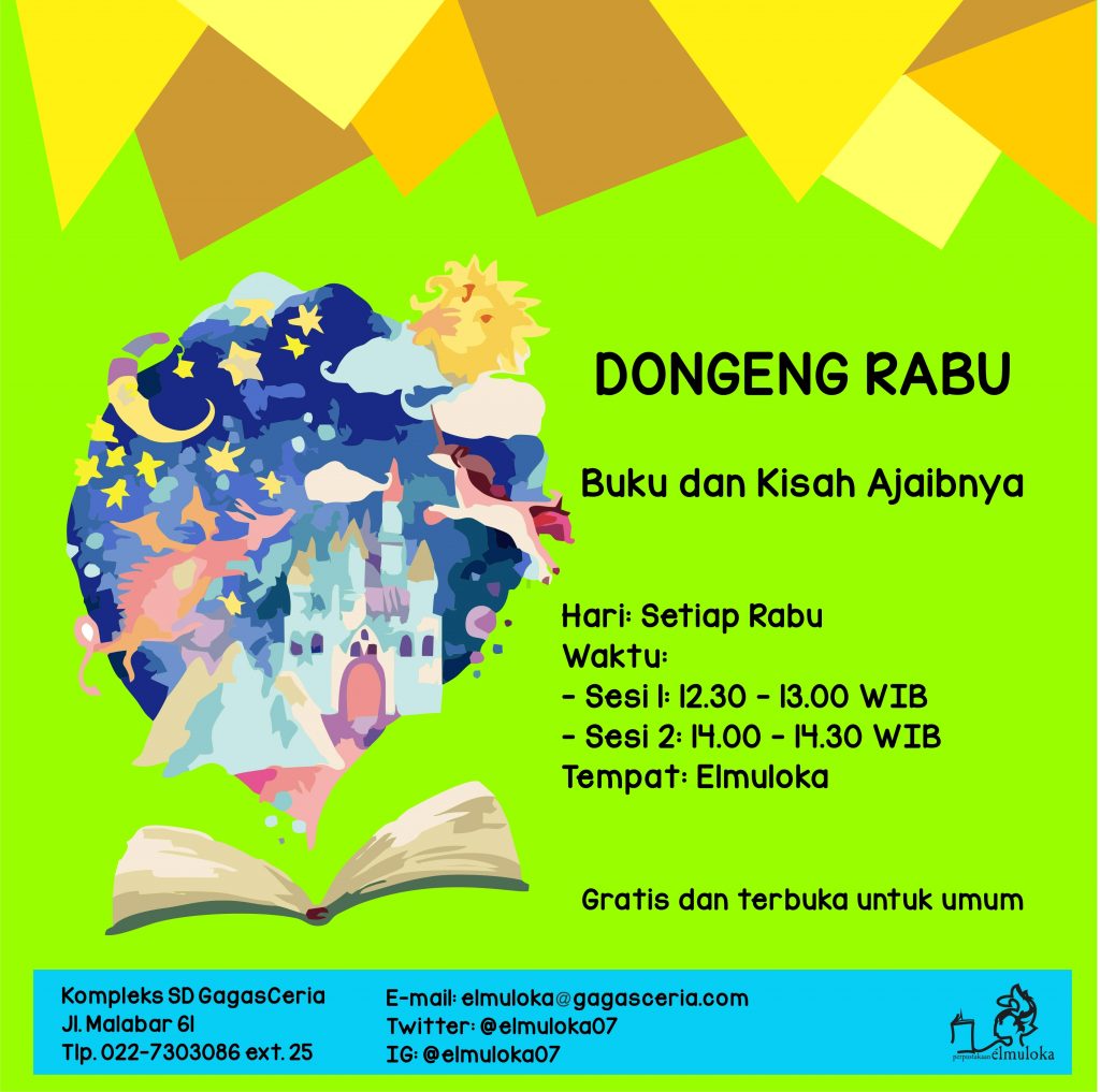 Kamu suka mendengarkan cerita? Datang saja ke Elmuloka setiap hari Rabu. pada pkl. 12.30 WIB atau 14.00 WIB. Bulan Februari ini, ada cerita-cerita tentang Buku dan Kisah Ajaibnya. Kegiatan ini cocok untuk anak usia 3 – 9 tahun. Gratis dan terbuka untuk umum.
